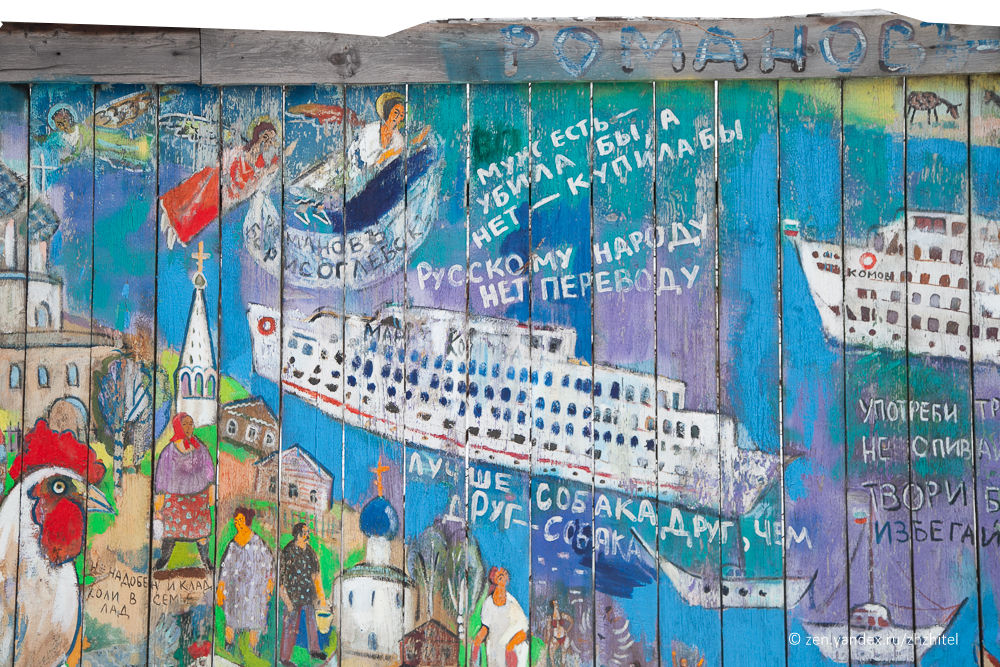 Именитые художники, чьи работы выставляются в европейских музеях, выбрали для жизни маленький Тутаев, но, чтобы подчеркнуть свою принадлежность к миру искусства и поделиться этим искусством с местными жителями, Ольга расписала забор собственного дома так, что теперь здесь постоянно собираются местные жители подивиться наивному уличному искусству, и это чуть ли ни самое популярное место для фотосессий туристов.